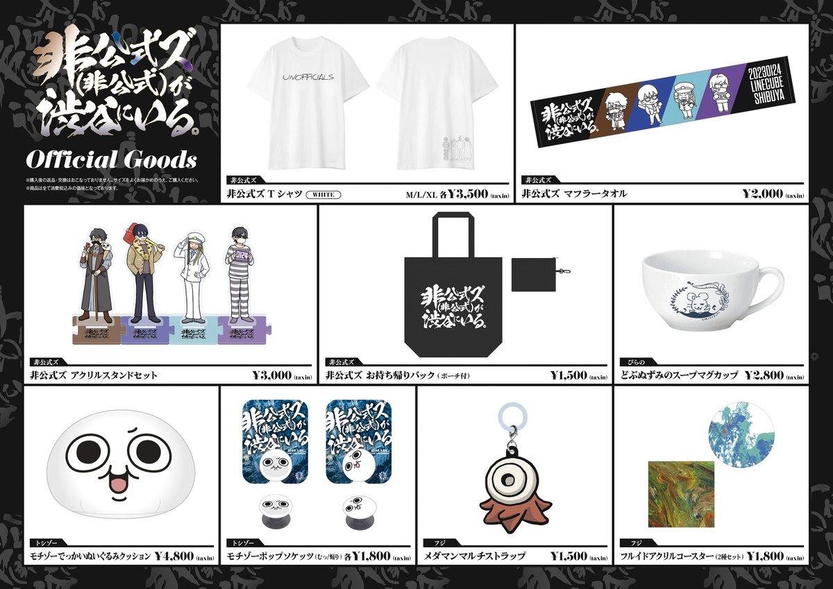 1/24開催「非公式ズ(非公式)が渋谷にいる。」にて販売されたグッズの受注販売は、2/6(月)23:59まで受付中です!