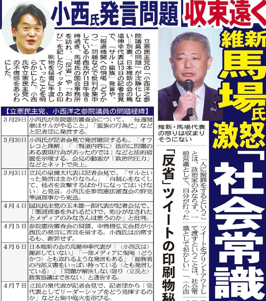 #立憲民主党 の #小西洋之 参院議員を痛烈に批判する #日本維新の会 の #馬場伸幸 代表ですが、過去の国会会議録を検索すると維新議員もしょっちゅう #サル発言 をしていることが判明しました。 nikkan-gendai.com/articles/view/… #日刊ゲンダイDIGITAL