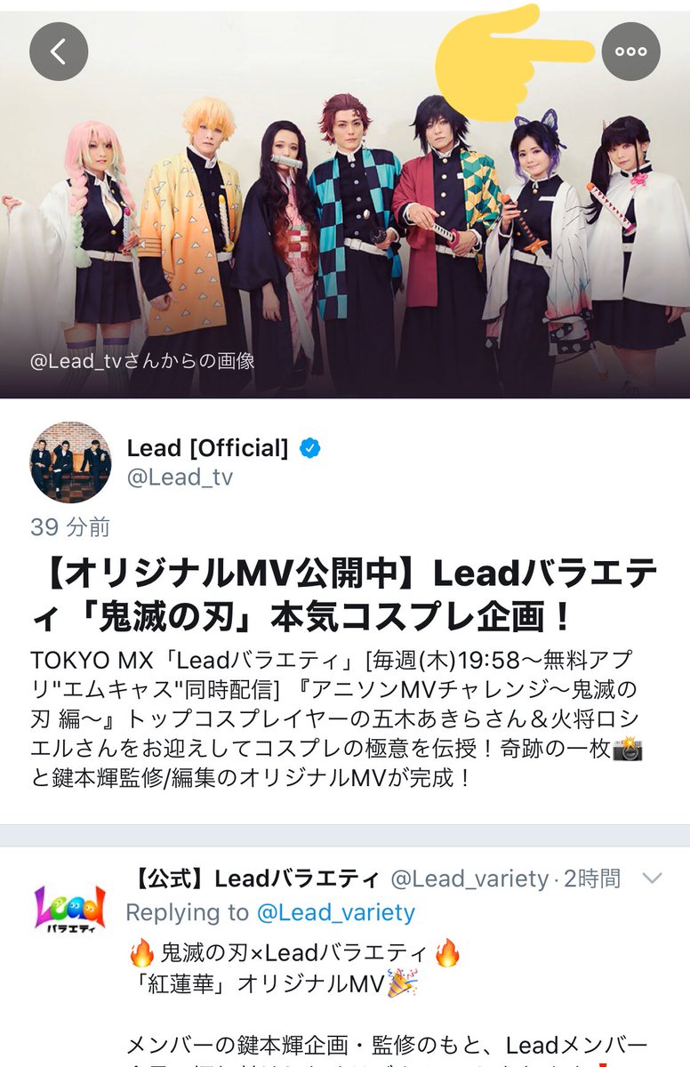 ⚡️【「#鬼滅の刃」本気コスプレ企画】Leadバラエティ『アニソンMVチャレンジ〜鬼滅の刃 編〜』 twitter.com/i/events/12912… #鬼滅のりーど #Leadバラエティ #リドバラ #五木あきら #火将ロシエル #Lead #岩崎春果 #平塚日菜