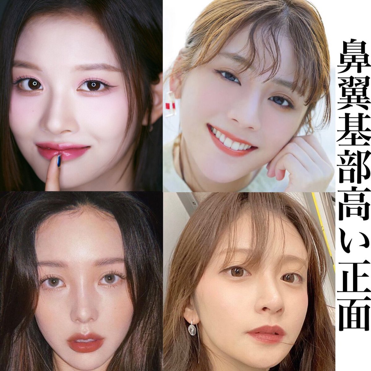 面長には ✔︎中顔面のっぽさん ✔︎顎クッキングパパさん の2種類がある。 特に中顔面のっぽさんはいかにミッドフェイスに立体感を与えるかが勝負⏬ ①鼻先〜耳直線上に平行チークメイク ②前髪も基本作る *宮脇咲良や冬子のセンター分けと前髪ありの対比が分かりやすい #鼻整形 #目頭切開