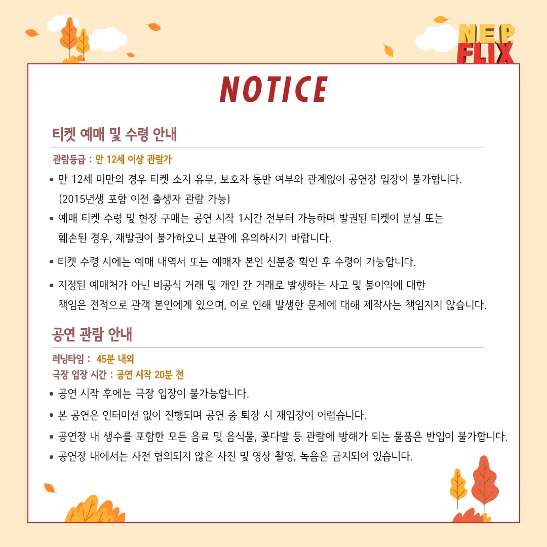 뮤지컬 쇼케이스 [#넵플릭스] 🕒 러닝타임 및 기타 안내 *자세한 내용은 이미지를 참고해 주세요. 2022.11.24-2022.11.26 대학로 자유극장(서울시 종로구 대학로12길 31) #네버엔딩플레이 #뮤지컬 #쇼케이스