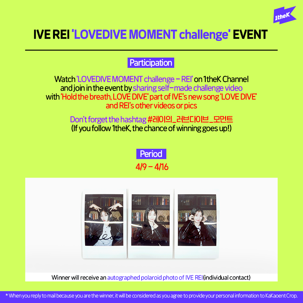 #레이의_러브다이브_모먼트 해시태그와 함께 #아이브 #레이 의 멋있는/귀여운 모먼트가 담긴 영상/사진을 활용한 챌린지 영상을 업로드 해주세요! 추첨하여 레이의 싸인 폴라로이드를 드립니다. (@1theK 팔로우😉/당첨자 개별연락)