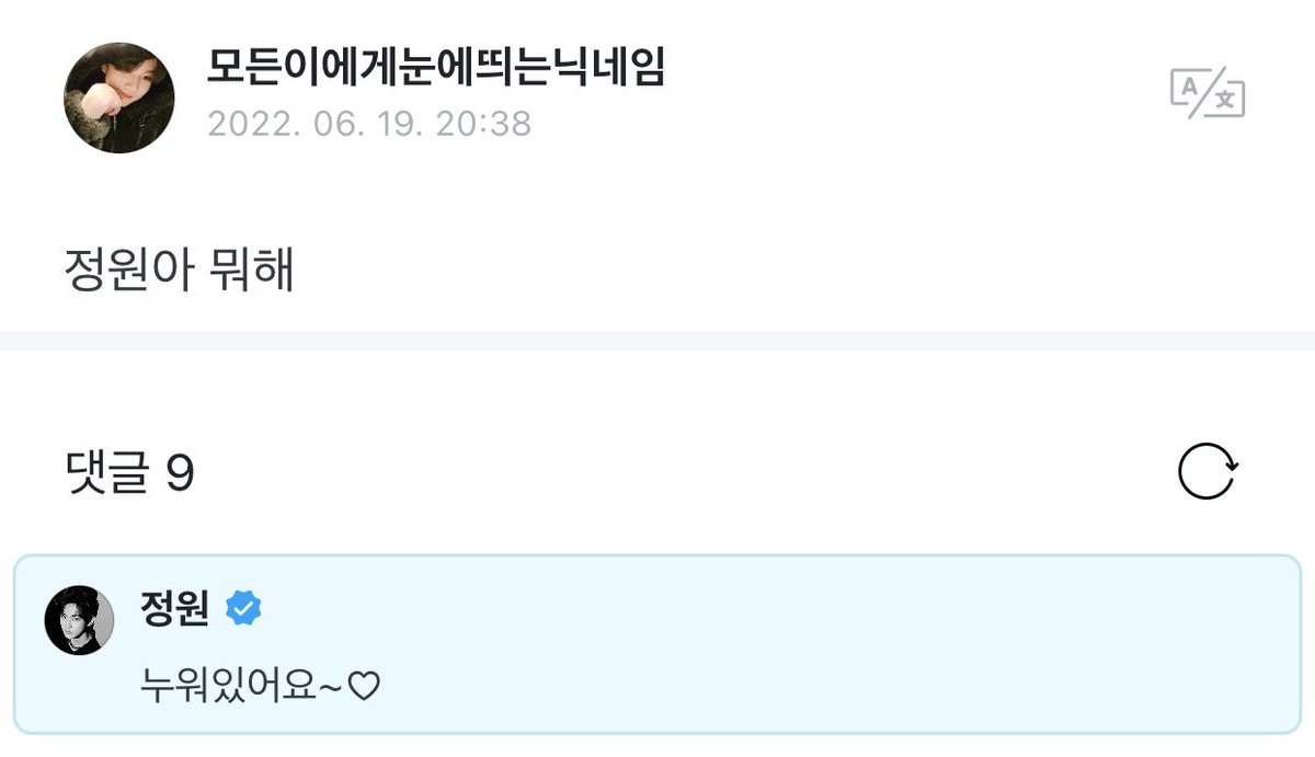 ’s Reply ] 220619 OP: Heok Jungwon-ah...!!! Bed selca this time.. ♡ 🐈: Ah that's right 🐈: Wait a moment 🐈: I'll upload it on Twitter♥️