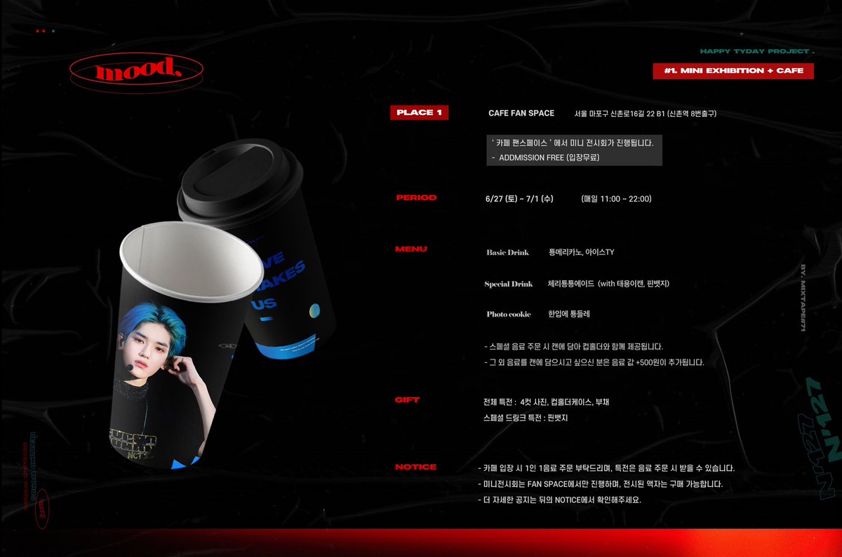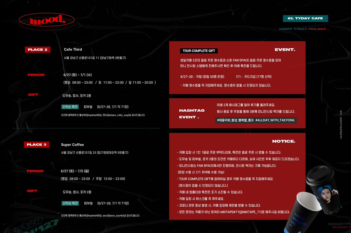 🌹 𝑴𝑶𝑶𝑫 𝐇𝐚𝐩𝐩𝐲 𝐓𝐀𝐄𝐘𝐎𝐍𝐆 𝐃𝐚𝐲 𝐃- 𝟑𝟑 ─ Mini Exhibition & Cafe 𝗙𝗔𝗡 𝗦𝗣𝗔𝗖𝗘 TYday Cafe 𝗖𝗮𝗳𝗲 𝗧𝗵𝗶𝗿𝗱 & 𝗦𝘂𝗽𝗲𝗿 𝗖𝗼𝗳𝗳𝗲𝗲 #태용이와_항상_행복할_툥프 #ALLDAY_with_TAEYONG