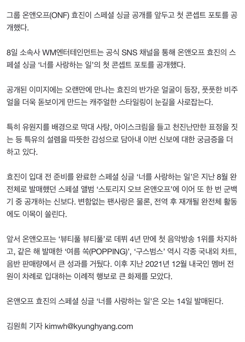 230206 Article: ONF Hyojin to release new song '너를 사랑하는 일' (Love Things) on the 14th.... a surprise gift ahead of military discharge