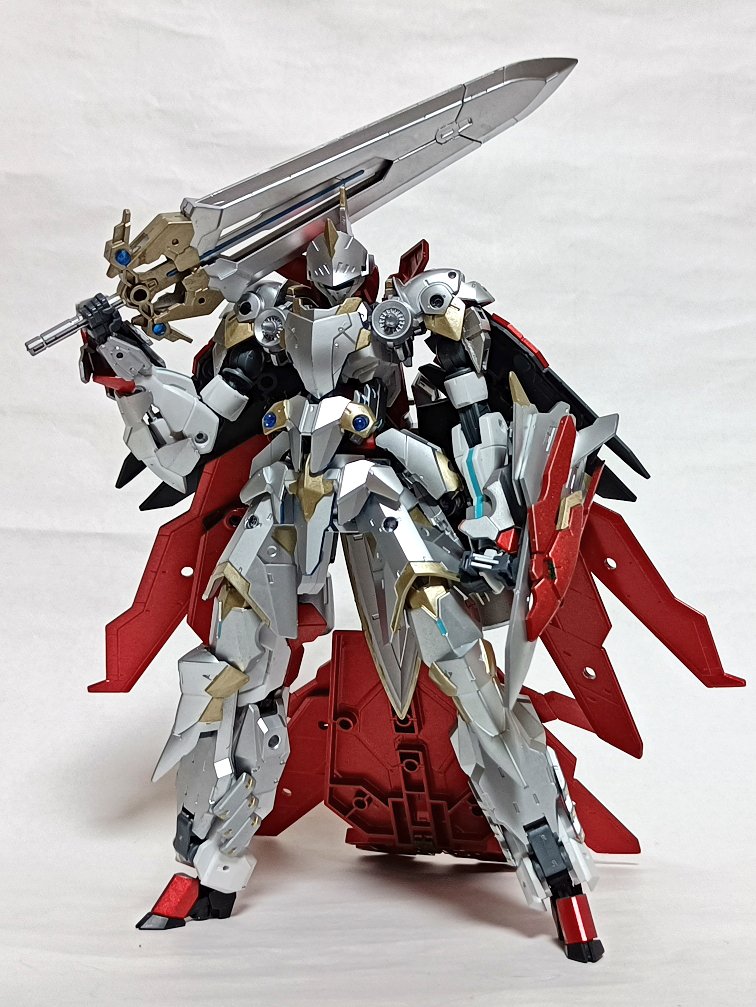 三叉に展開するブースターを装備したナイト仕様のカスタムスピナティオ。天魔剣「カルム・ヴェルク」による圧倒的な剣撃で宇宙戦の先陣を切る