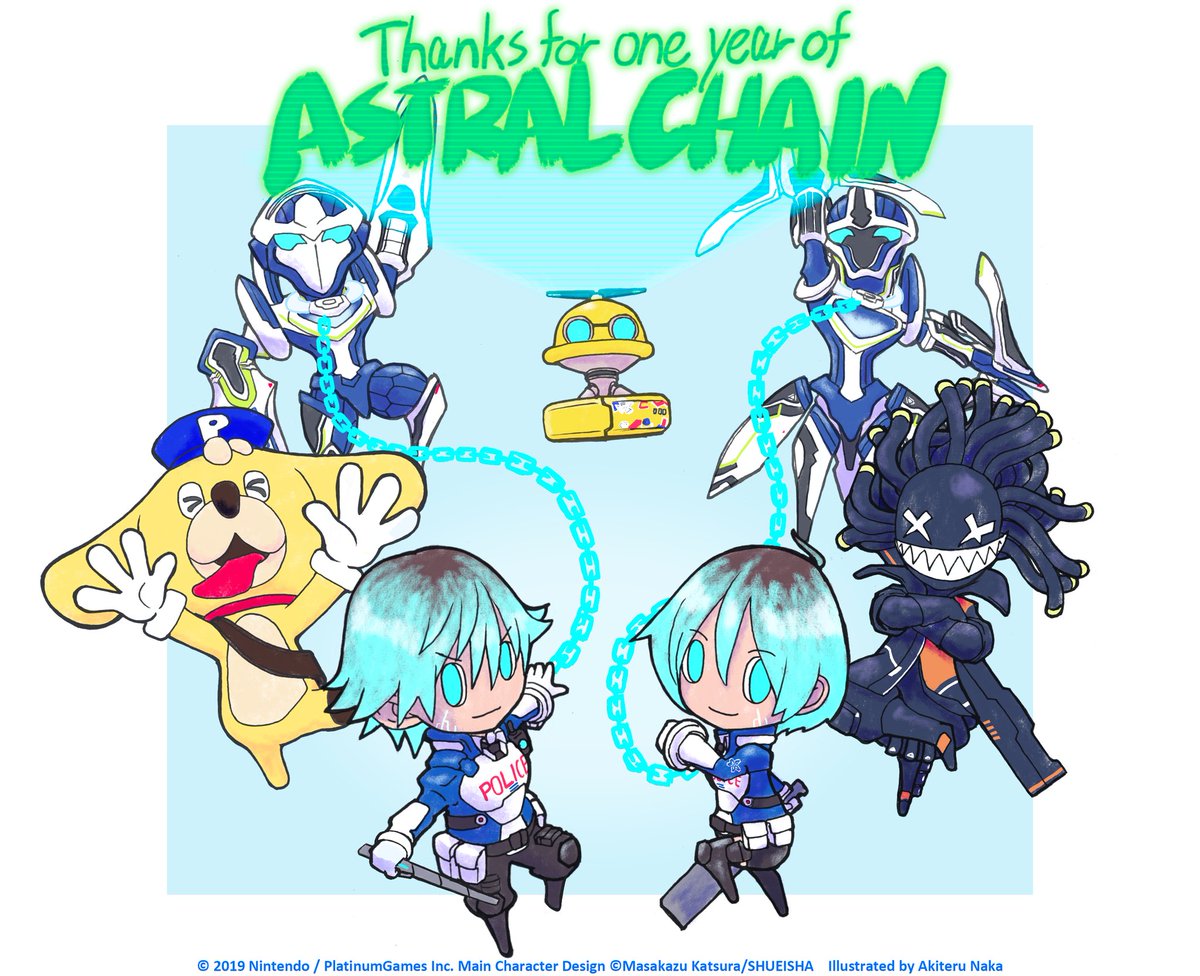 ASTRAL CHAIN 発売1周年!アート担当の須田とシナリオ担当の仲によるお祝いイラストです!多くの方々にプレイしていただき、大変嬉しく思っています。ありがとうございますー!