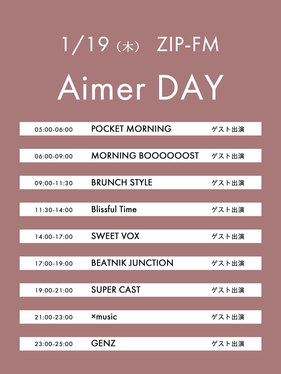 本日1/19(木)にZIP-FMで放送される9番組に #Aimer がゲスト出演中!