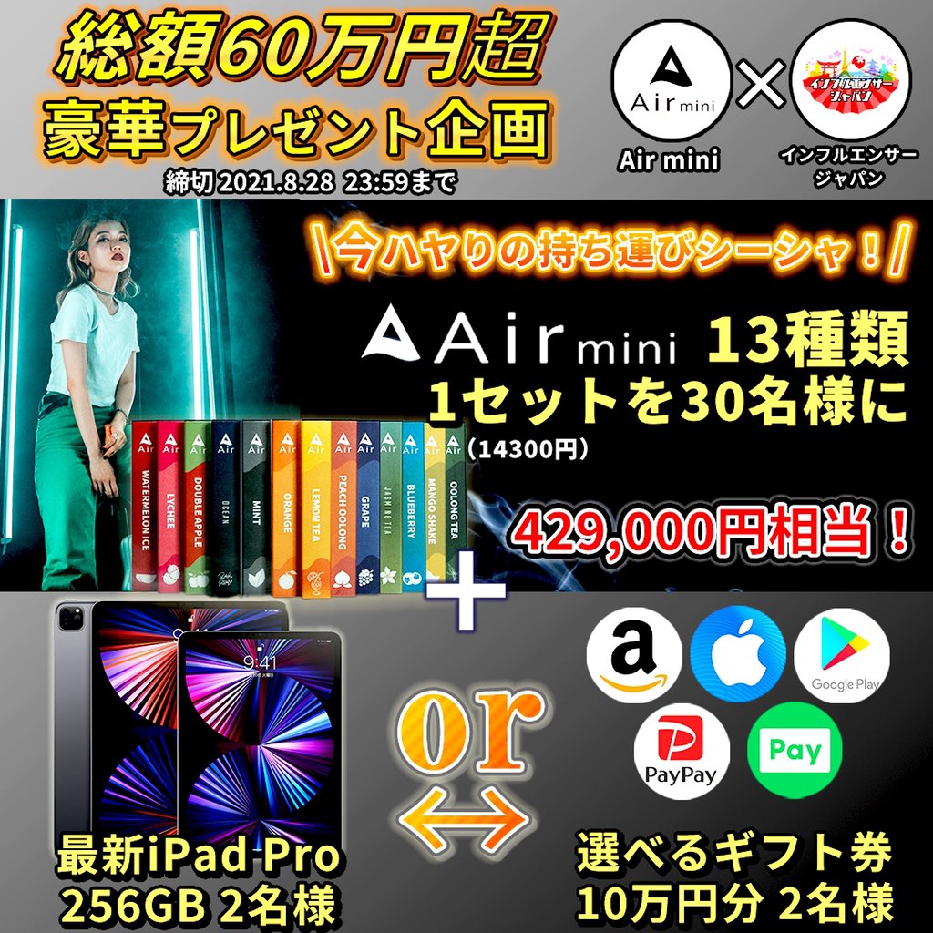 ②話題沸騰中の持ち運びシーシャ #Airmini 12本1セットを30名様✨