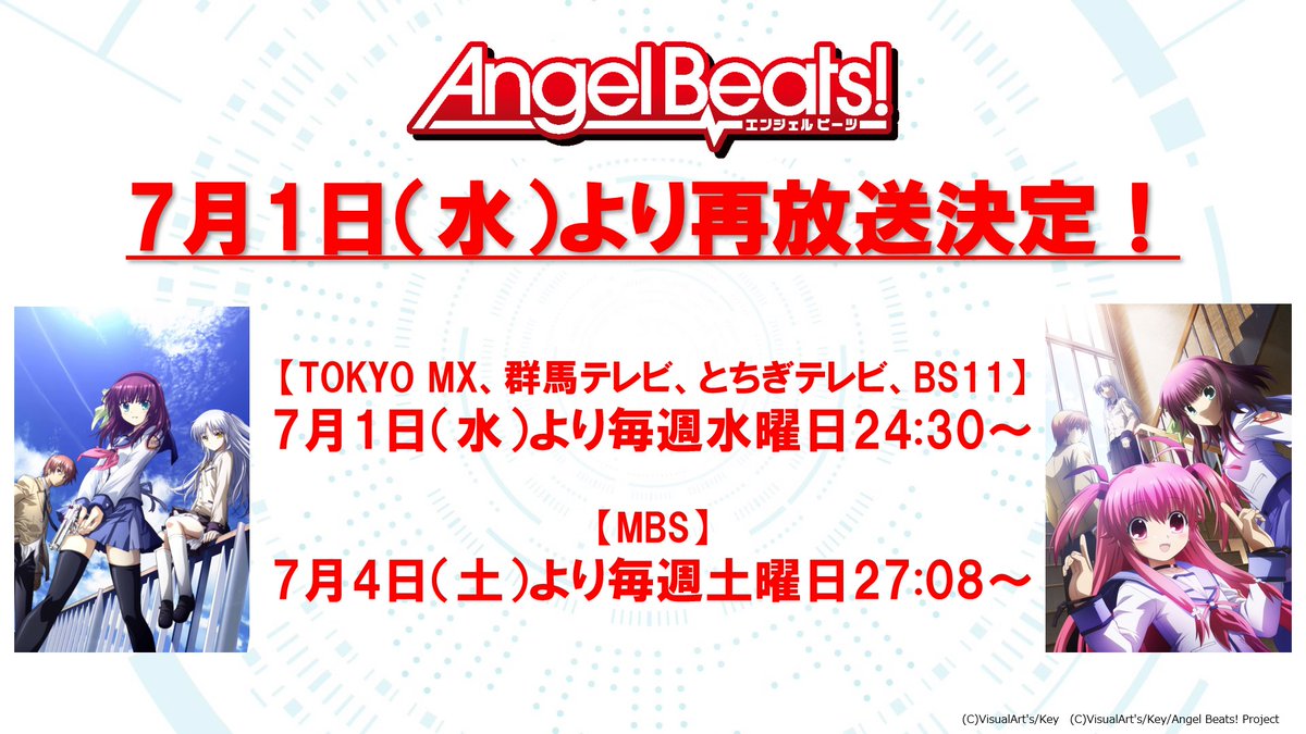 いよいよ明日7月1日(水)24時30分より、TOKYO MX、群馬テレビ、とちぎテレビ、BS11にて「Angel Beats!」再放送開始!