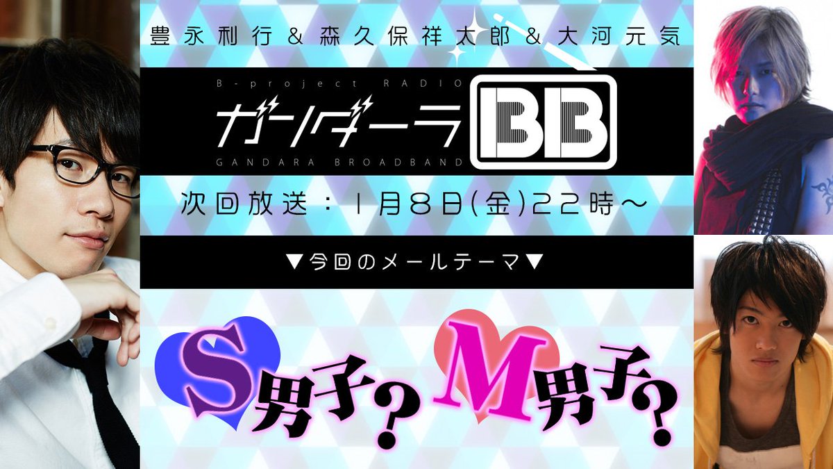 今夜22時~放送!【ゲスト森久保祥太郎&大河元気】Bプロラジオ『ガンダーラBB』新年最初のメールテーマは「S男子orM男子?どっちが好き?」宛先⇒ch.nicovideo.jp/loveart/blomag ※加藤さんはお休みです※ #Bプロ pic.twitter.com/UkAQbEXwW9