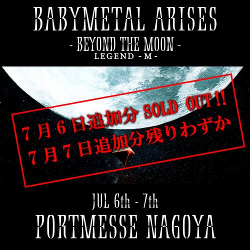 今週末(7月6日・7日)名古屋にて開催する『BABYMETAL ARISES - BEYOND THE MOON - LEGEND - M -』 機材席解放につき、チケット追加発売中DEATH!!