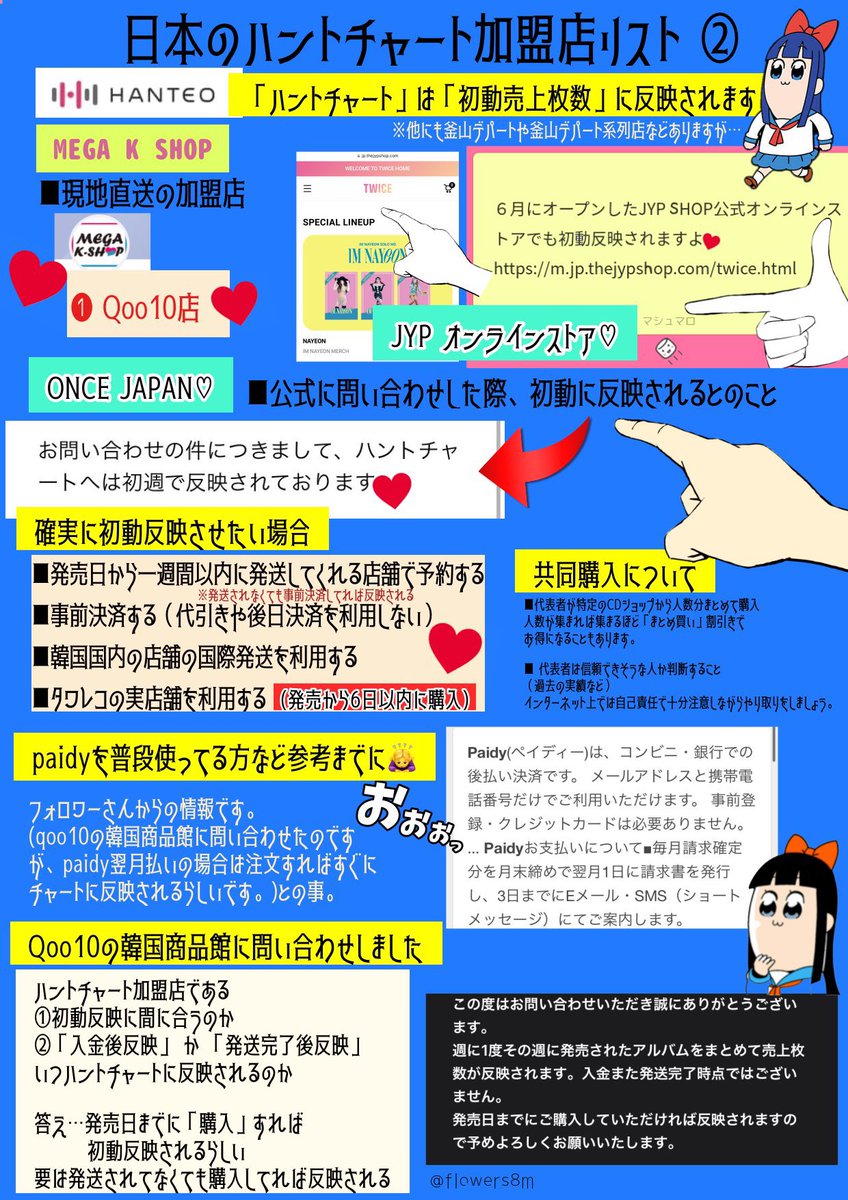 明日から韓国アルバムの予約が始まります!ハントチャート加盟店で購入するようよろしくお願いします!!せっかく買うならtwiceの成績に反映されるほうがいいよ!アマゾンとかHMVは反映されないから気をつけてー!