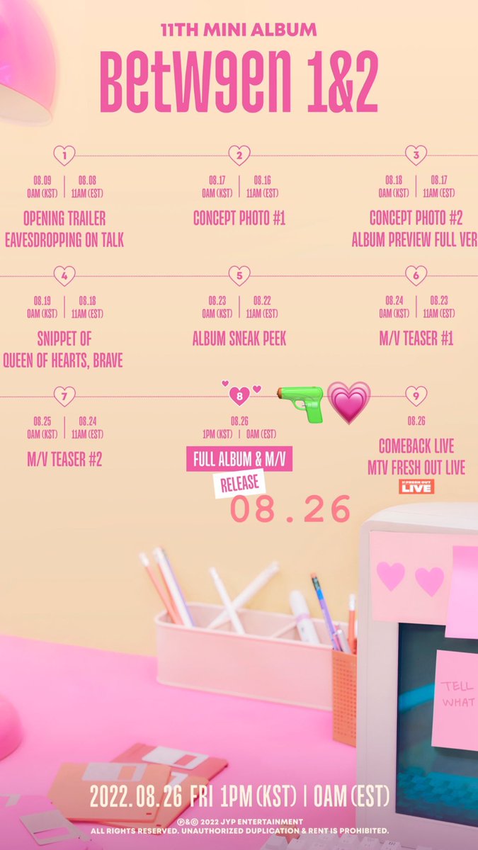 Let the countdown begin for @JYPETWICE's comeback. The band will drop a series of teasers until its grand return on Aug. 22. The girls will also be tuning in with @MTV's "Fresh Out Live" and hold a live comeback show, so stay tuned for more! 💗 #BETWEEN1and2 #TalkthatTalk #TWICE