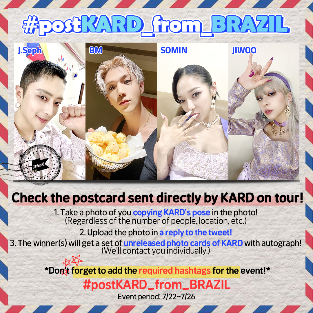 투어를 떠난 #KARD(@KARD_Official) 가 #BRAZIL 에서 보내온 엽서를 확인하고 포즈를 따라한 인증샷을 답글로 남겨주세요!👍