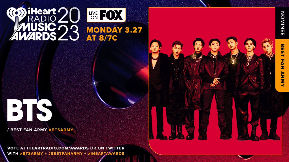 I vote #BTSArmy as the #BestFanArmy at the 2023 #iHeartAwards!