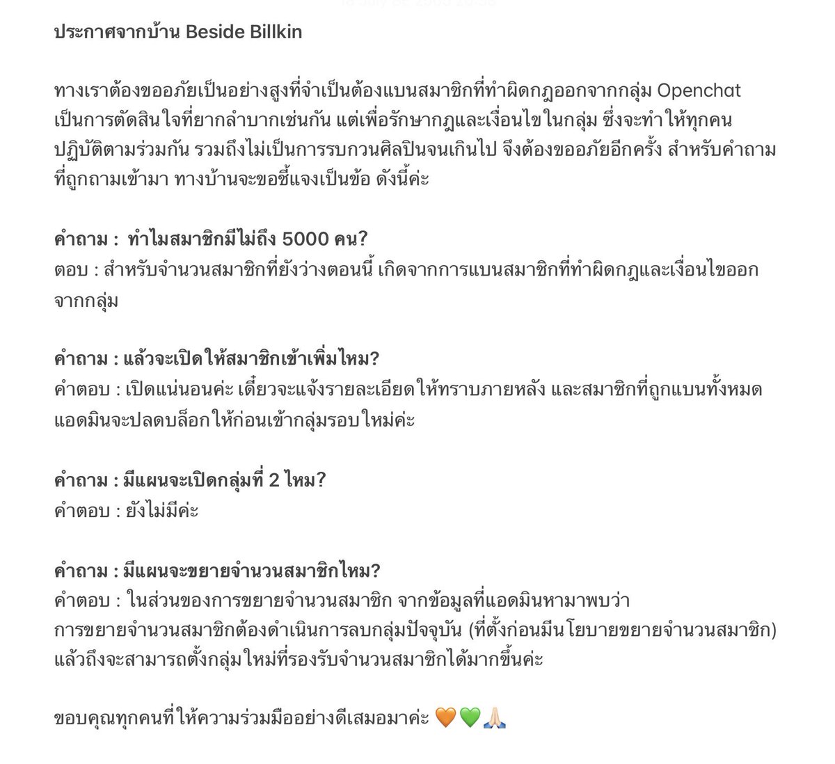 ทางเราไม่สนับสนุนให้เสียเงินในทุกกรณีนะคะ ที่ผ่านที่ต้องมีการจัดระเบียบ เนื่องจากมีการซื้อ-ขาย สิทธิ์ในการเข้ากลุ่ม ขอเน้นย้ำว่าทุกข้อความของบิวกิ้นใน open chat จะถูกนำมาอัพเดตให้ทุกคนทราบอย่างแน่นอนค่ะ 🙏🏻🧡💚