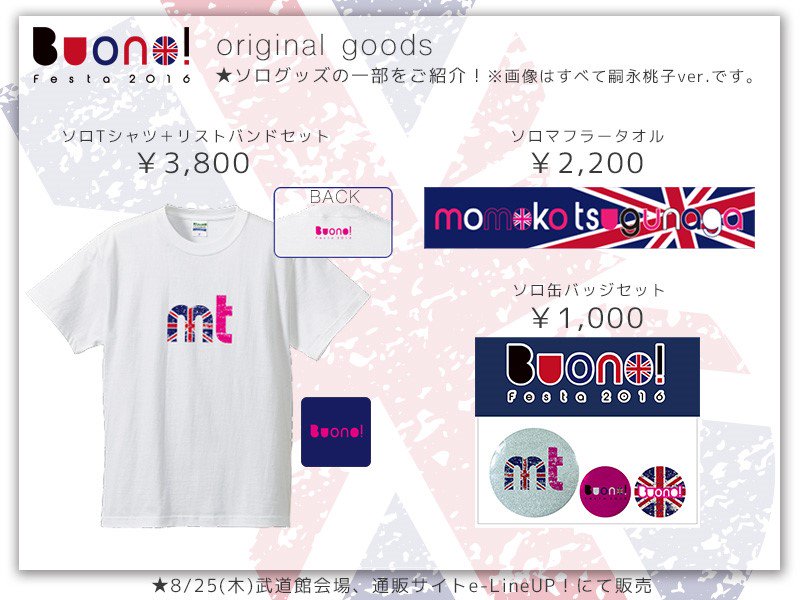 【売切情報】Buono!Tシャツ(全サイズ)、ソロTシャツセット(嗣永・Sサイズ)、ソロマフラータオル(鈴木)、マイクロファイバータオル(Buono!・嗣永)Buono!セットが完売いたしました。
