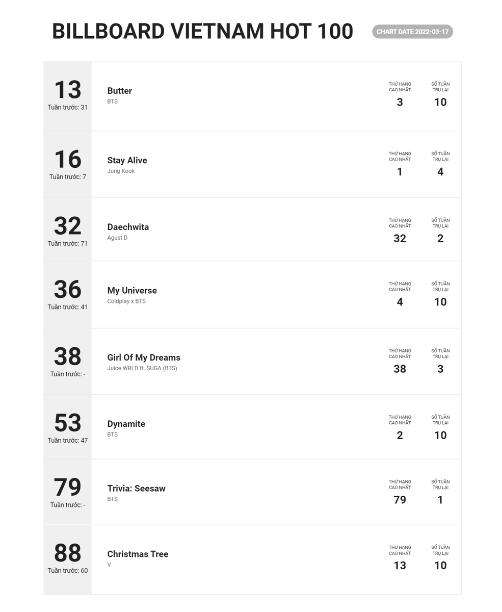 #BTS' #Butter tops the #billboardhottrendingsongschart for 18 of the Ranks’ 26 weeks, the longest run at #1 and is the only act to succeed itself atop the chart!💪🥇🇺🇸🔥💥🎶📈✖️1️⃣8️⃣👑💜Former #1, #PTD returns 12-8 and #MyUniverse with #Coldplay reenters at #20👏🕺📈8️⃣➕🌌2️⃣0️⃣🔙💙