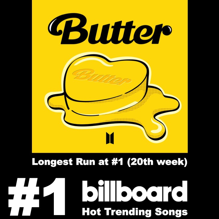 Army celebrate #BTS’ #Butter spending a milestone 20th week at #1 on the weekly #BillboardHotTrendingSongschart, extending its record for longest running #1 hit in the chart's history!💪🥇🇺🇸🔥💥🎶📈✖️2⃣0⃣👑💜