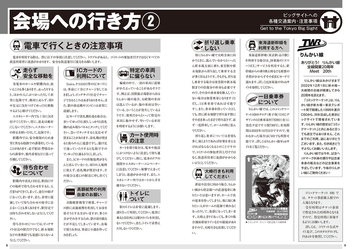電車を利用する際には、下記の注意事項に注意下さい。トラブルがあると、コミケット参加者ばかりでなく、すべての鉄道利用者の方々のご迷惑となります。安全な鉄道運行へのご協力をお願いします。#C100