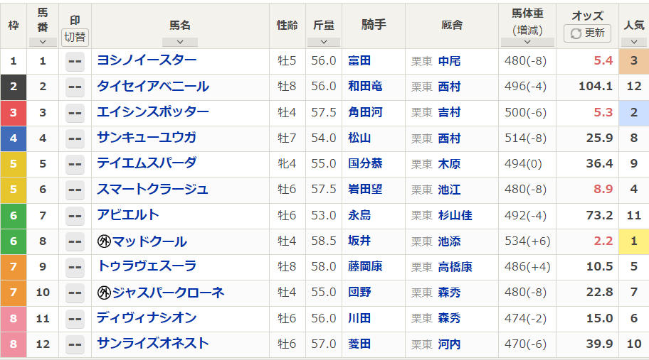 マッドクールは534kg(+6)、エイシンスポッターは500kg(-6)、ヨシノイースターは480kg(-8)。