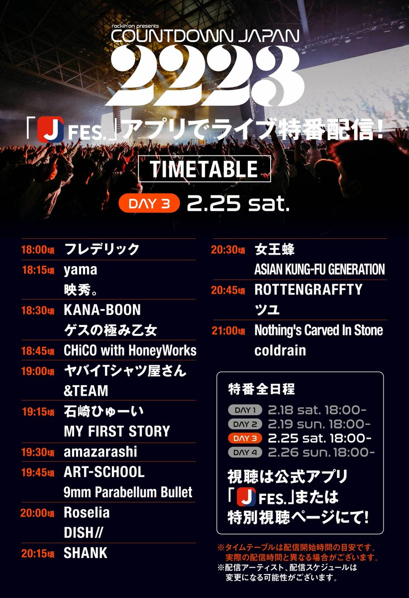 明日2/25(土)18:00より「Jフェス」アプリにて、昨年開催のCOUNTDOWN JAPAN 22/23のライブ映像特番が配信となります。