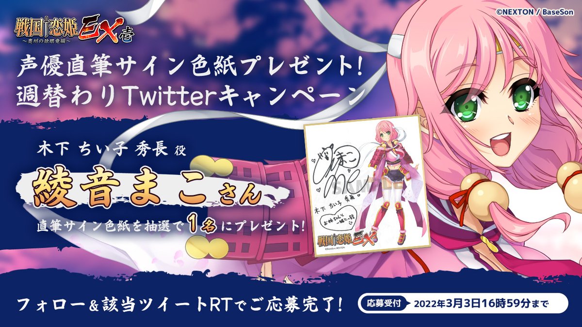 『戦国†恋姫EX壱』クラブネクストン先行公開を記念して「綾音まこ」さんの直筆サイン色紙を1名様にプレゼント!