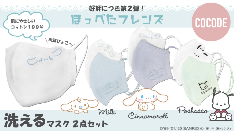 #COCODE オンラインショップから年中使える「ほっぺたフレンズ」にシナモロール、みるく、ポチャッコが仲間入り♪気分に合わせて使える2枚セットの洗えるマスクだよ☆お耳がぴょこっとカワイイね♡ sanrio.eng.mg/32731