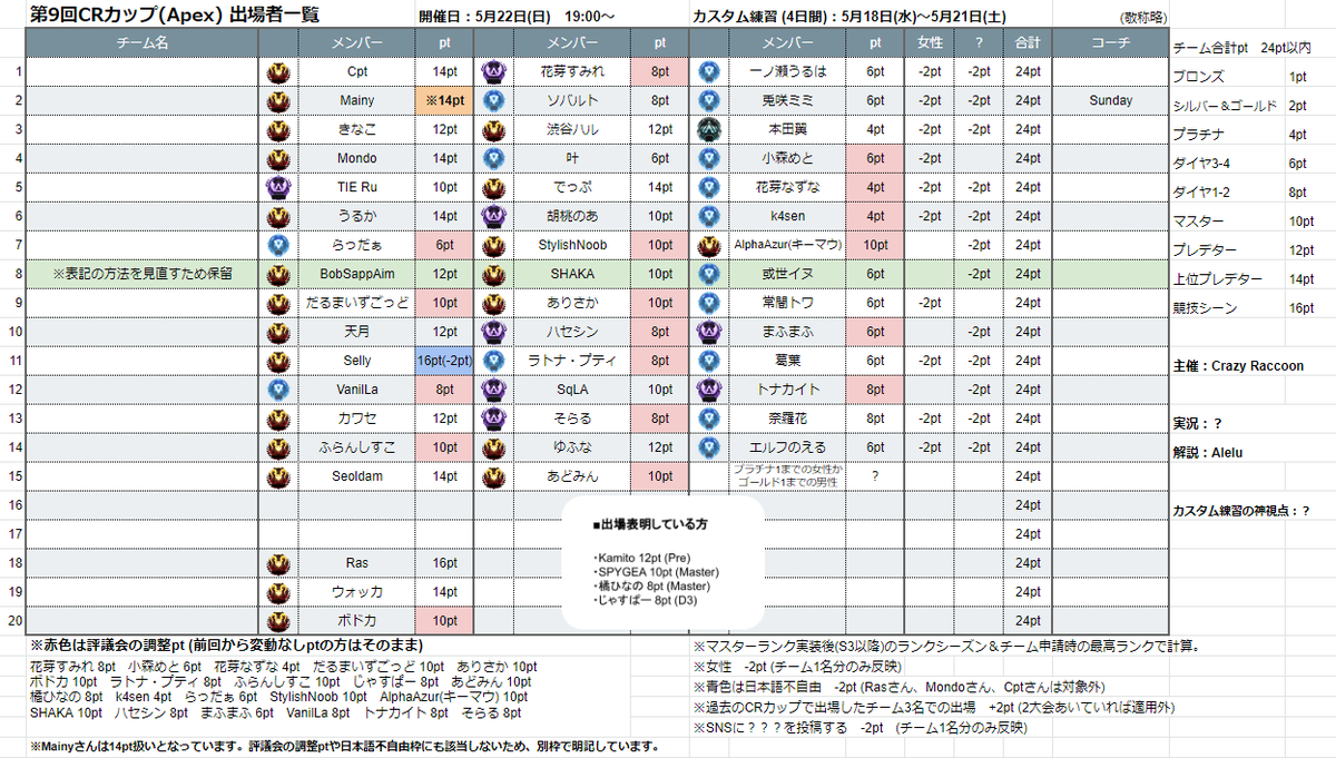 今大会はCRおじじさんのツイートでもあったように、評議会がかなり細部まで過去の結果等を追ってチームとして参加が可能かどうかを重視しているようなので、表のptについては参考程度にお考えいただけますと幸いです。