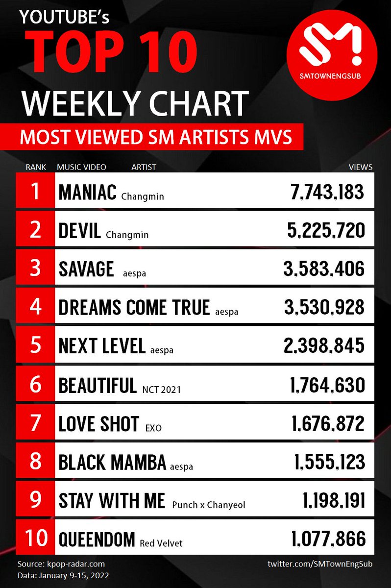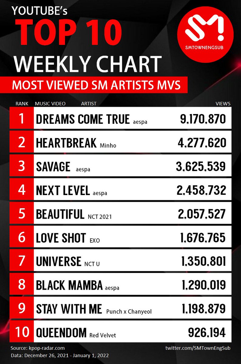 Top 10 Most Viewed SM Artists MVs on YouTube (Nov.21-27)