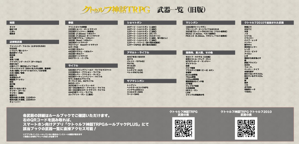 武器詳細は各書籍にて確認できますが、QRを読み取っていただければ #CoCルルブプラス の該当ページに直接アクセスできますよ!