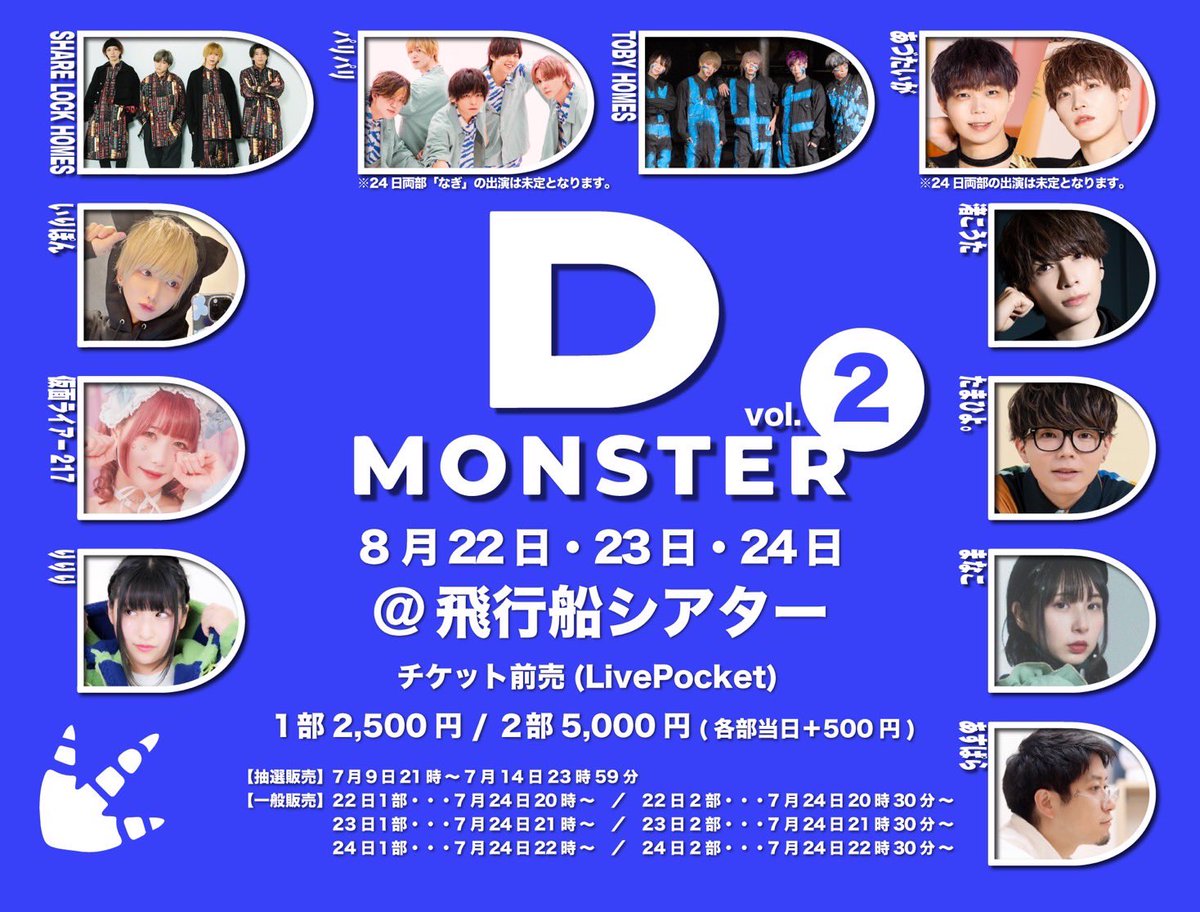 【重大告知‼️】 前回大好評だったDMONSTERのVol.2がなんと今回8月22、23、24日の3Days全6公演で開催!!🦖 一部は楽しさを凝縮したライト版!チケット代もお求めやすく! 二部はたっぷり楽しんでいただける大ボリューム!! 豪華出演者と踊ってみたで夏の思い出を作りましょう!!