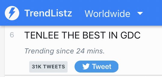ตอนนี้คีย์เวิร์ด "TENLEE THE BEST IN GDC” ของเตนล์กำลังขึ้นเทรนทวิตเตอร์ อันดับที่ 6 ของ Worldwide Trend แล้วค่ะ ✨