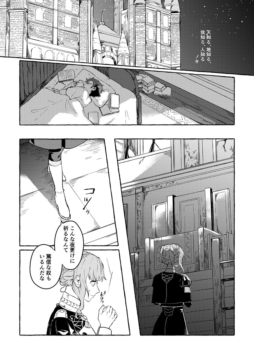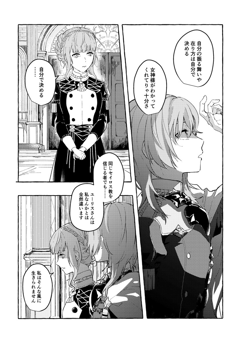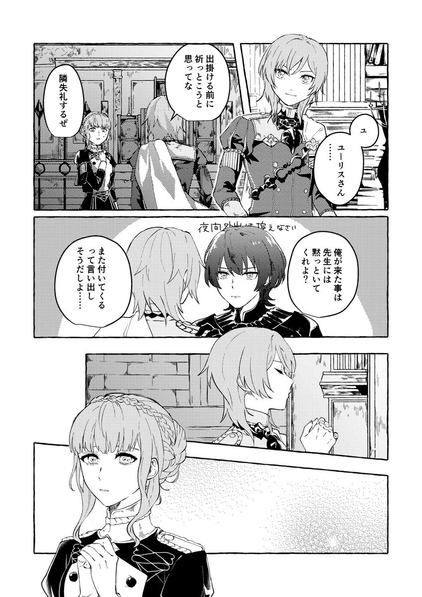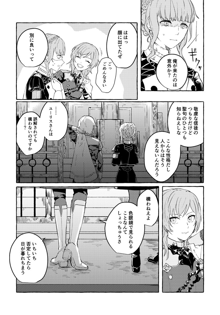 マリアンヌとユーリスで参加しました!支援会話のない組み合わせで描くという素敵なコンセプトのアンソロに参加できて光栄でした。ありがとうございました!(1/3)