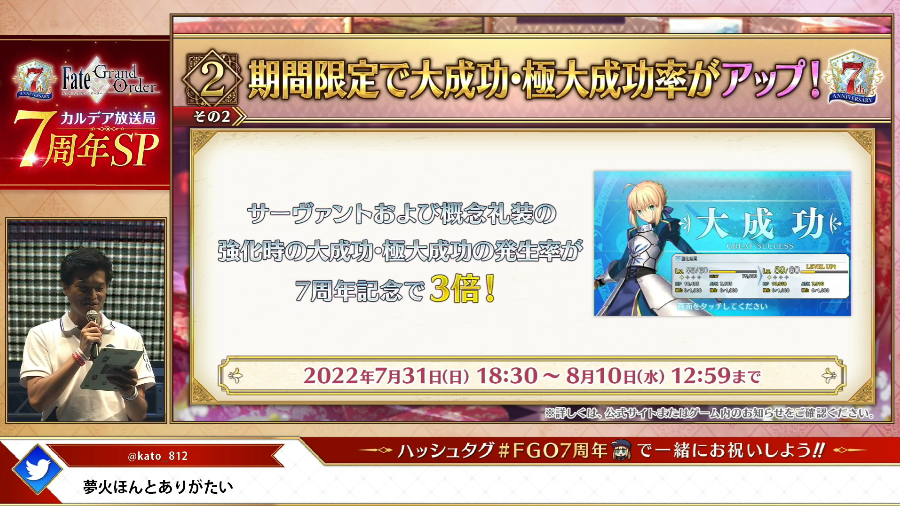 7月31日(日)9:00より「Fate/Grand Order」の7周年を記念した「7周年記念限定ミッション」の一部が追加で開放されました!ミッションを達成して、7周年記念限定概念礼装「英霊夢装」と交換できるチケットをゲットしよう!詳しくは→news.fate-go.jp/2022/7th_missi… #FGO #FGO7周年