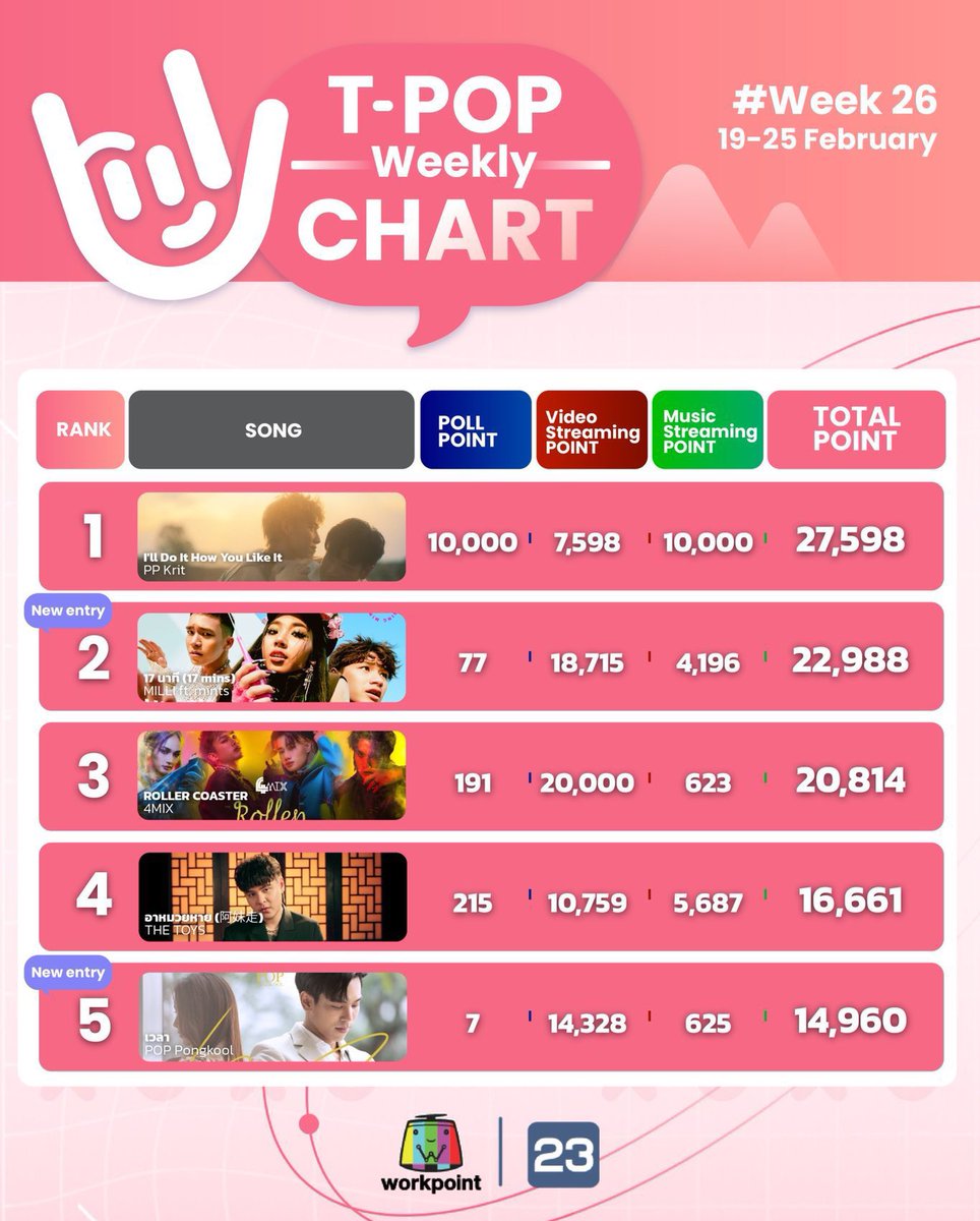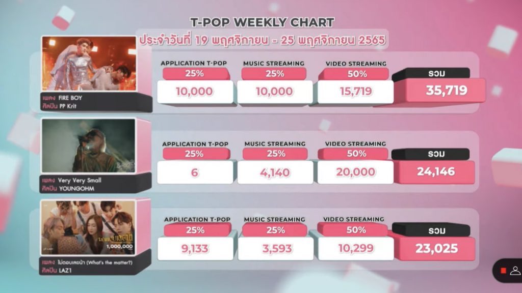 ไปย้อนดูมาเหมือนกับว่าคะแนนของน้องฟอยวีคนี้จะมากที่สุดเท่าที่เพลงน้องพีพีเคยทำได้เลยคับ