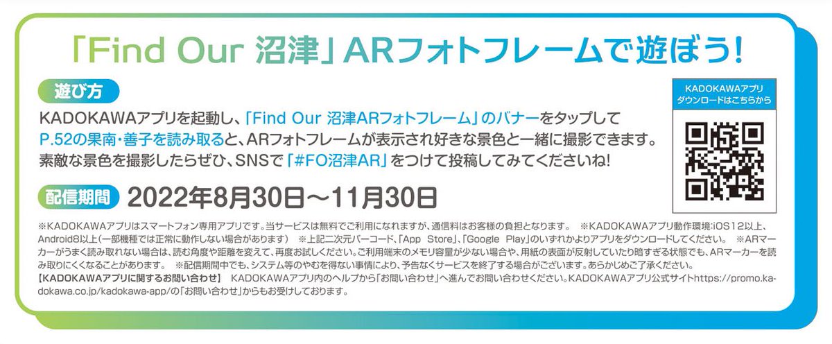 📸FO沼津ARフォト企画♪📸 「ラブライブ!総合マガジンVol.31」のP.52「Find Our 沼津」の果南&善子をKADOKAWAアプリAR機能で読み込むと、2人の姿がARフォトフレームとして表示されて一緒に撮影可能に✨ 素敵な写真が撮れたら #FO沼津AR をつけて 投稿してください♪ #lovelive #Aqours