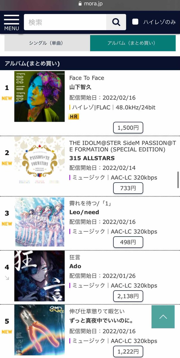 オリコンミュージックストアランキング(集計:2022/2/16)