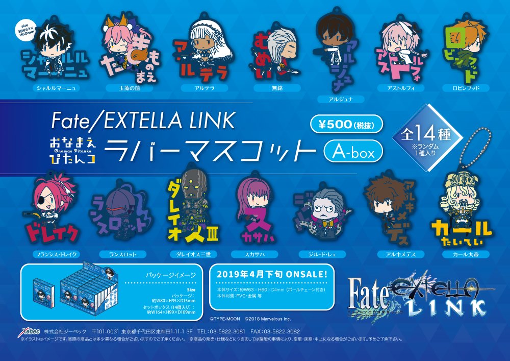 【新商品のお知らせ②】キャラクターが名前と一緒にポーズ✨オリジナル描き起こしシリーズ「おなまえぴたんコ」にFate/EXTELLA LINKより26名のサーヴァントが仲間入り!ボールチェーン付きのラバーマスコットがA・Bbox同時に2019年4月下旬発売予定です!詳細は→xebec-news.xebec.jp/?eid=45