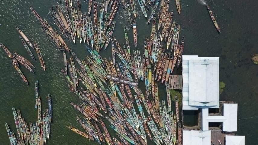 ミャンマーのシャン州にあるインレー湖の様子。伝統的な舟を使っての抗議です。個性的です。#Feb22Coup #SaveMyanmar #HearTheVoiceOfMyanmar #RejectMilitaryCoup
