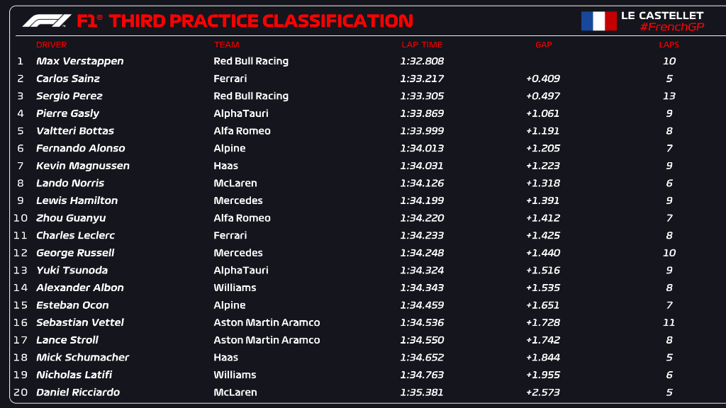 That's it for Practice 🏁 Max finishes FP3 in P1 with a 1:32.272 and Checo is P5 with a 1:33.293 ⏱ #FrenchGP 🇫🇷
