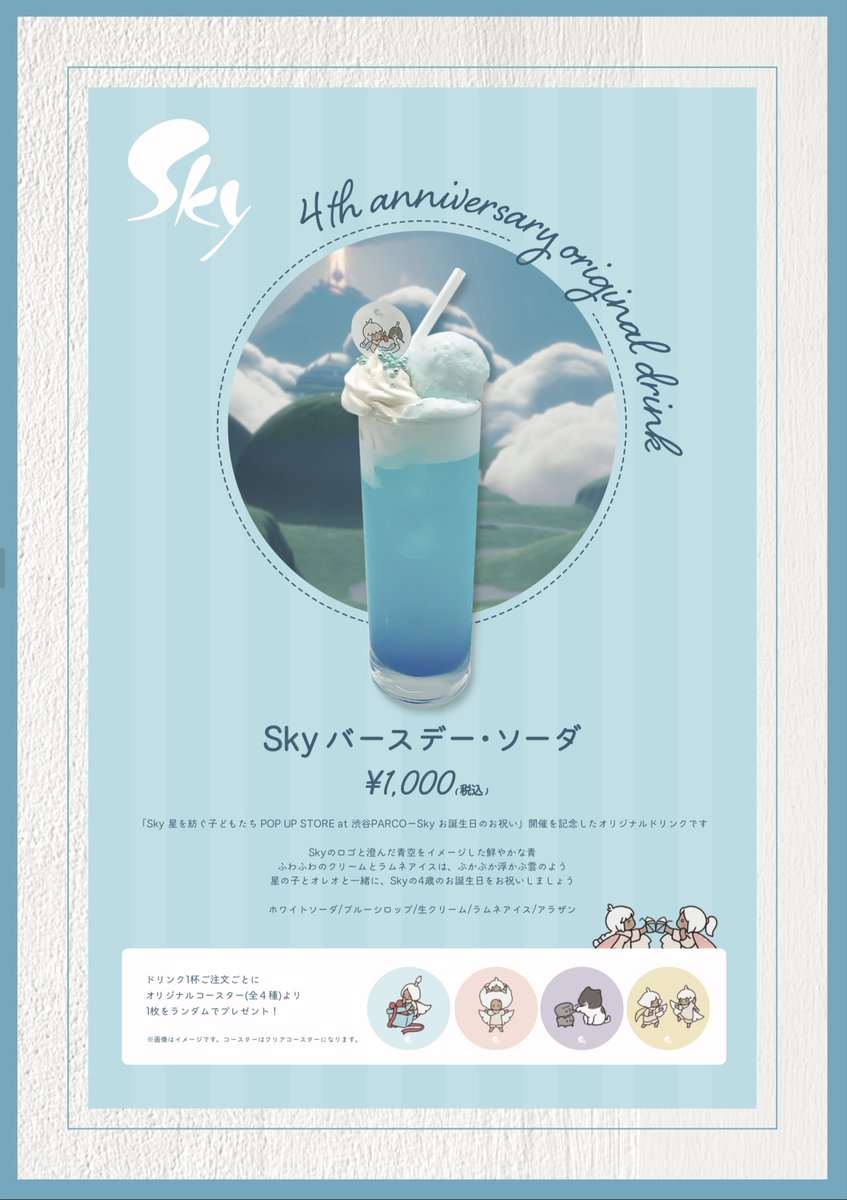 星の子どもたちとTio🦀の声にお応えして、『Sky バースデー・ソーダ』が数量限定で@GshibuyaG に再登場します!1杯のご注文につき、ランダムでオリジナルコースターが1つもらえます🥰