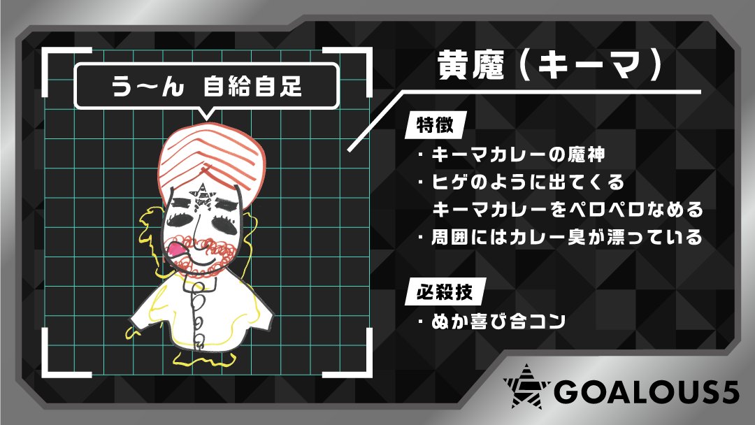 第38回でゴーラスイエロー・寺島惇太が考えた分身となるキャラクター「黃魔(キーマ)」。周囲にはカレー臭が漂います。
