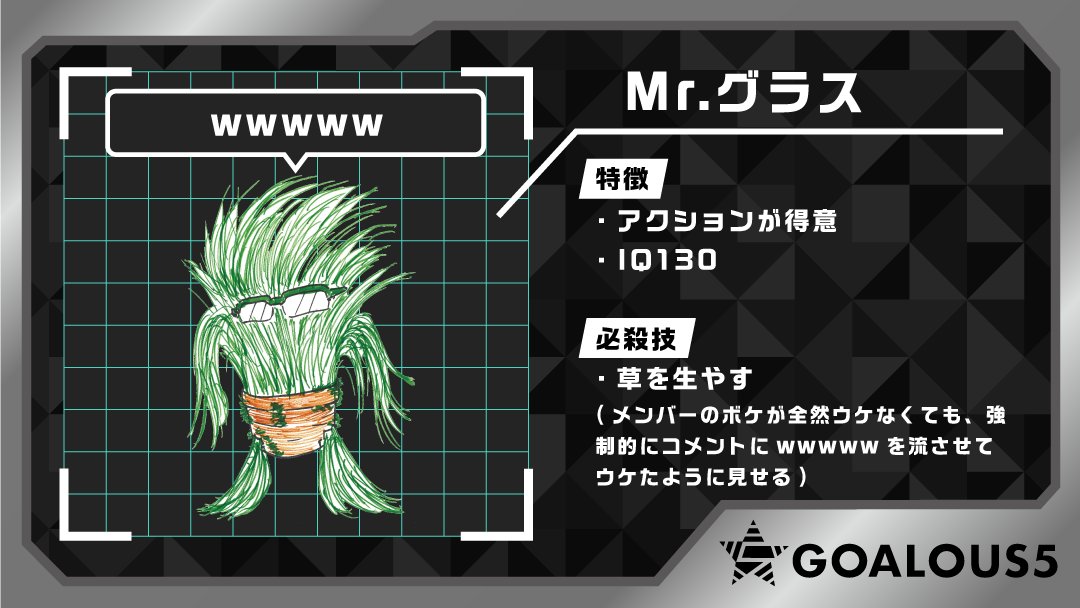第41回でゴーラスグリーン・小松昌平が考えた分身となるキャラクター「Mr.グラス」。草を生やしますwwwww。#GO5