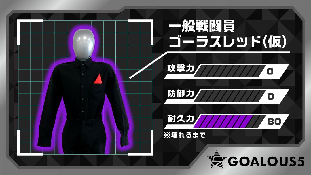第7回「GOALOUS5のGO5(ゴーゴー)チャンネル」に登場した一般戦闘員。2人の技を受け続けた彼の活躍が認められ、ゴーラスブルー、ゴーラスグリーンから「ゴーラスレッド(仮)」と命名されました。#GO5