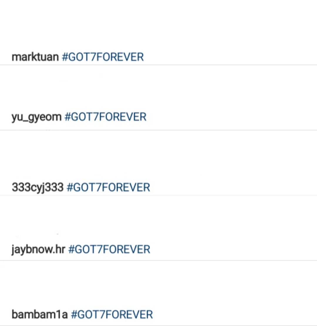 Members of GOT7 including JB, Mark, Yugyeom, Youngjae, and BamBam share Instagram posts with the same photo and caption "#GOT7FOREVER" following recent news