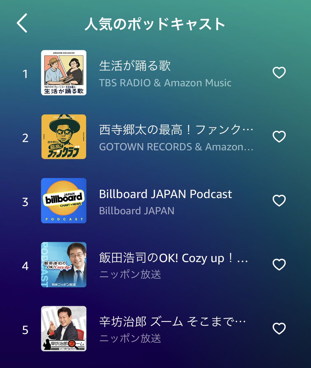 Amazon Music 人気のポッドキャストで錦織一清さんをゲストに迎えた「西寺郷太の『最高!ファンクラブ』」が2位に^ ^!一回しか放送してないので大健闘(聴取時間で計算されるので!)。@amazonmusicjp では #GOTOWNPodcast Club のアーカイブも聴けます!無料でも聴けます。 music.amazon.co.jp/podcasts/7fa0b…