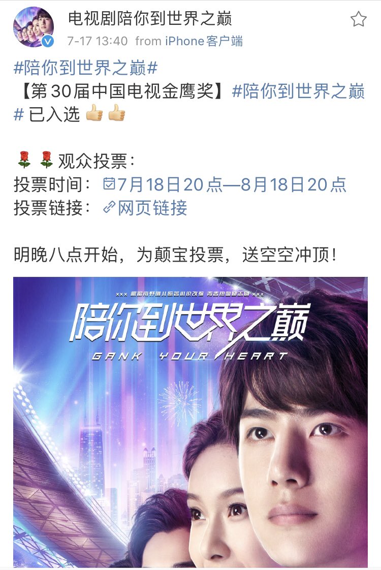 ซีรีส์เกมนี้มีรัก Gank Your Heat ที่นำแสดงโดยหวังอี้ป๋อ ได้รับเลือกชิงรางวัลในงาน 30th Golden Eagle Award