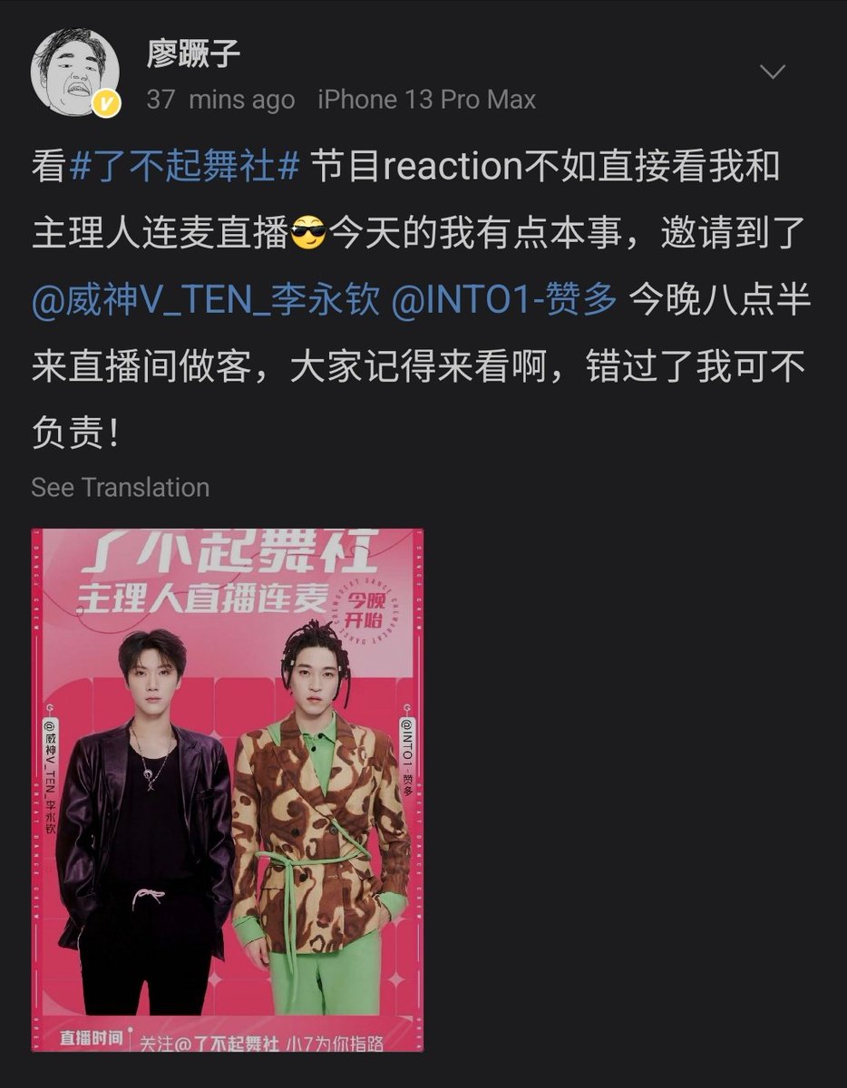 ดูรีแอคชั่น #GreatDanceCrew ไม่เท่ากับดูฉันและลีดเดอร์ต่อไมค์ไลฟ์ด้วยกัน วันนี้ฉันมีความสามารถเล็กน้อย เชิญ #เตนล์ และ ซานตะ มาเป็นแขกรับเชิญในไลฟ์ คืนนี้ เวลา 19:30 น. (ไทย) ทุกคนอย่าลืมมาดู พลาดแล้วฉันไม่รับผิดชอบนะ
